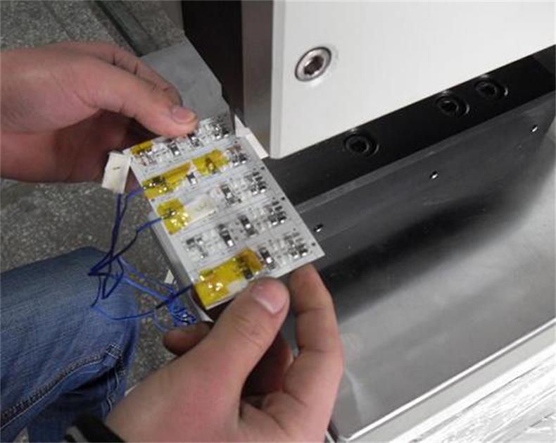 將要進行分切的V-CUT連板的V形槽對準下切刀的刀刃口,順著刀刃送入到刀內適當位置進行防呆,然后腳踩腳踏閥,氣缸工作使上切刀下降,從而將V-CUT連板分離.