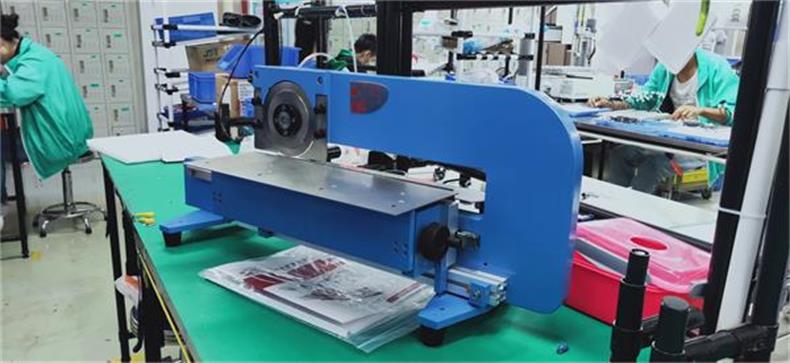 將要進行分切的V-CUT連板的V形槽對準下切刀的刀刃口,然后手推手柄,下切刀沿線性導軌前后移動,圓形刀被動旋轉,從而將V-CUT連板分離。