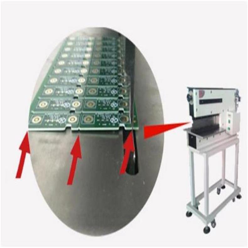 將要進行分切的V-CUT連板的V形槽對準下切刀的刀刃口,順著刀刃送入到刀內(nèi)適當(dāng)位置進行防呆,然后腳踩腳踏閥,氣缸工作使上切刀下降,從而將V-CUT連板分離.